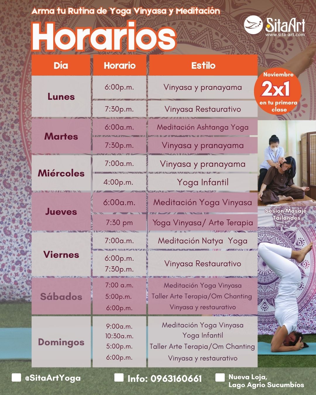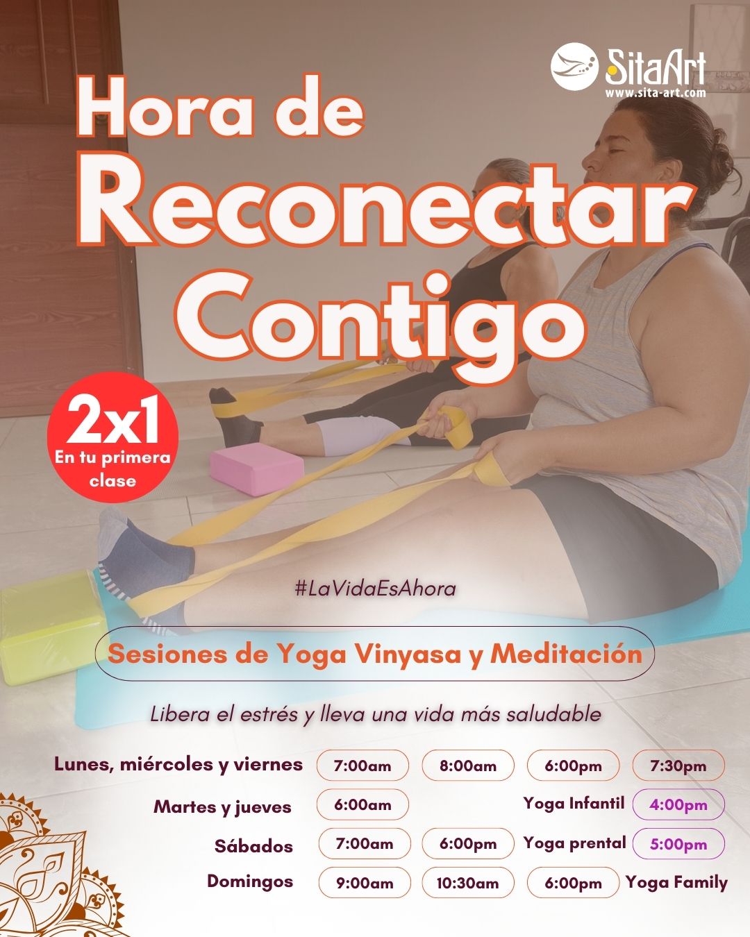 En Sita Art Yoga el Yoga es una terapia integral que va más allá de una postura y estiramiento físico: ✔️ Alinear el cuerpo dentro de la postura o Asana ✔️ Aprenderás a respirar con conciencia, Pranayama. ✔️ Practicarás mudras gestos con las manos, yoga facial y visual. ✔️Meditación guiada para reducir el estrés. ✔️ Explorarás el poder de los mantras sonidos que ayudan a la atención plena. ✔️ Recibirás material de estudio parte de la geometría sagrada que irás coloreando es cada clase para seguir crecer y trascender los retos de la vida diaria. 👉 Agenda tu clase o paquete en el horario que mejor se adapte a ti y empieza a transformar tu día a día.